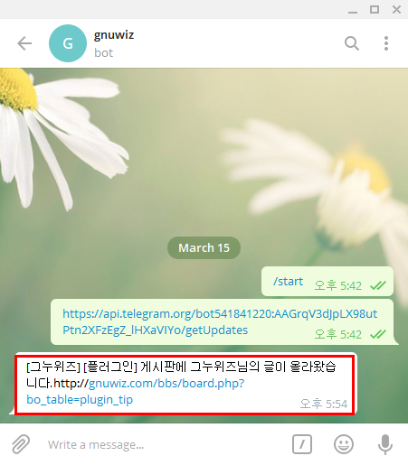 텔레그램의 채팅 bot을 이용해서 그누보드의 회원가입, 게시글 작성, 쪽지 전송 등