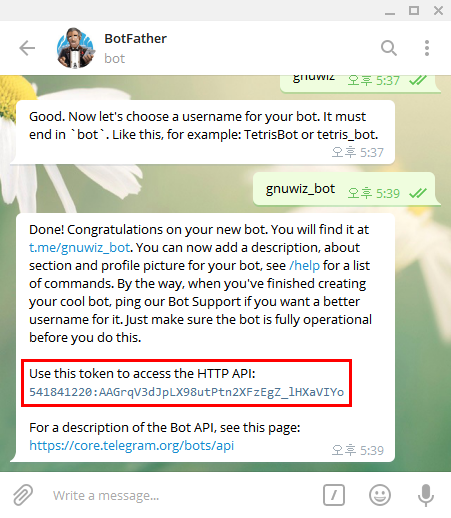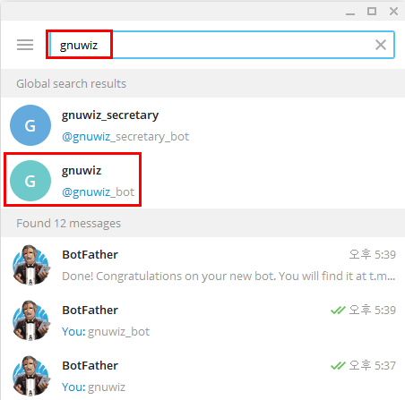 저 같은 경우에는 봇 이름이 "gnuwiz" 이기 때문에 "gnuwiz_bot" 이라고 입력했습니다.