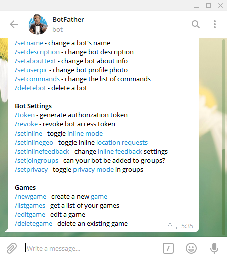 1.https://telegram.me/botfather 링크에 접속합니다.