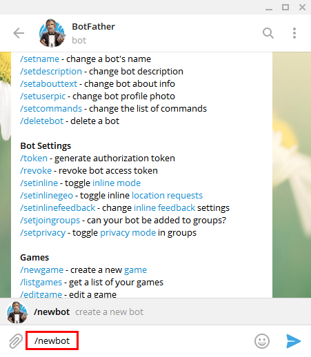 채팅창에 아래와 같이 /newbot 을 입력하고 엔터를 누릅니다.